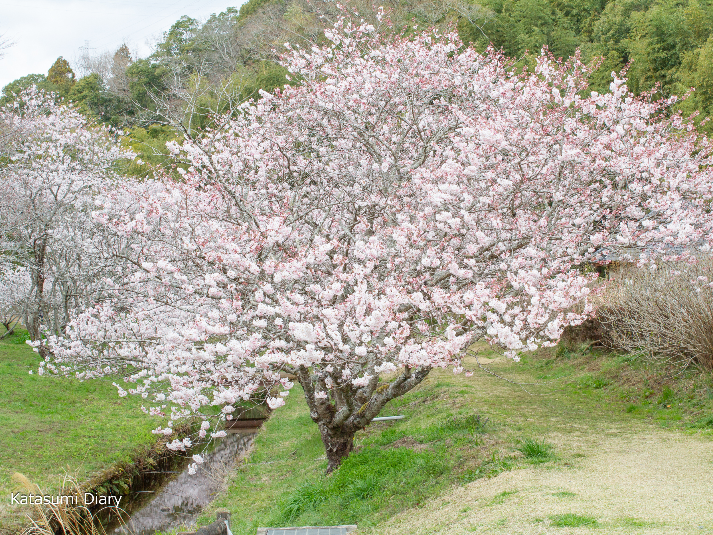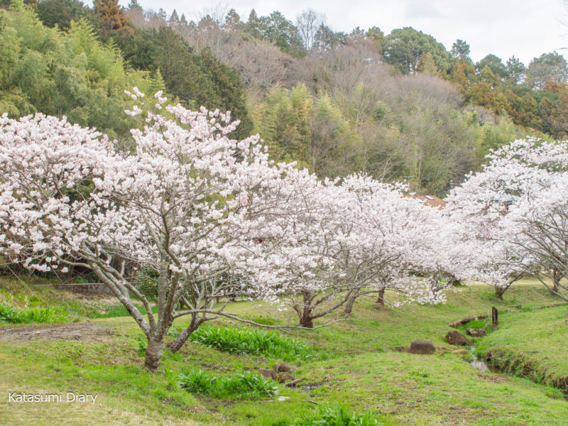 同市内の森と水の公園では、小川が流れており、その小川の両側(北岸13本、南岸17本)に春めき桜が植えられておりますほか、東側エリアの広場の外周に24本、広場の南側杉林沿いに10本ほどの春めき桜を楽しむことができるようになっております。