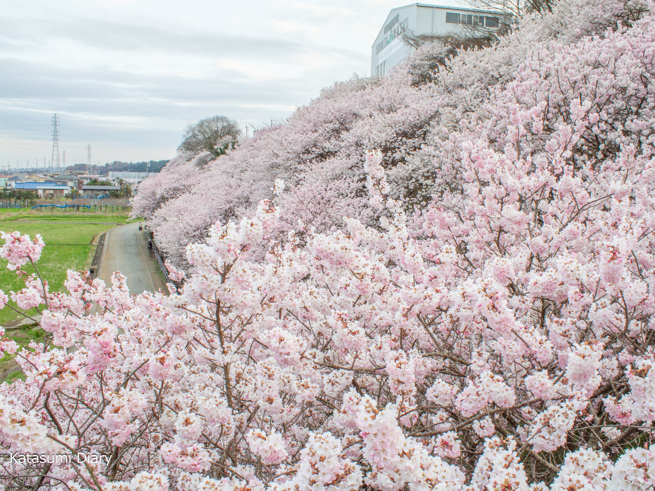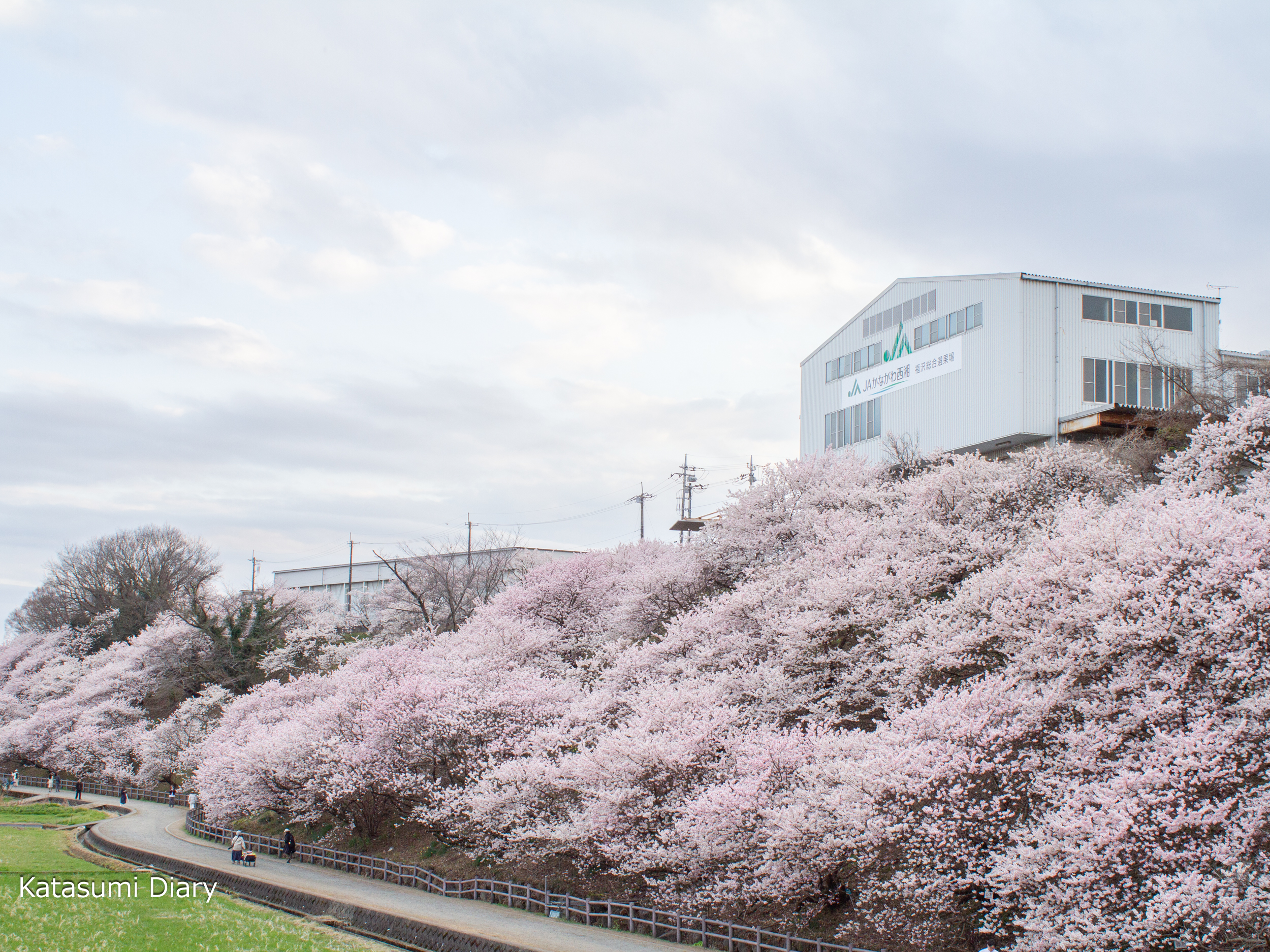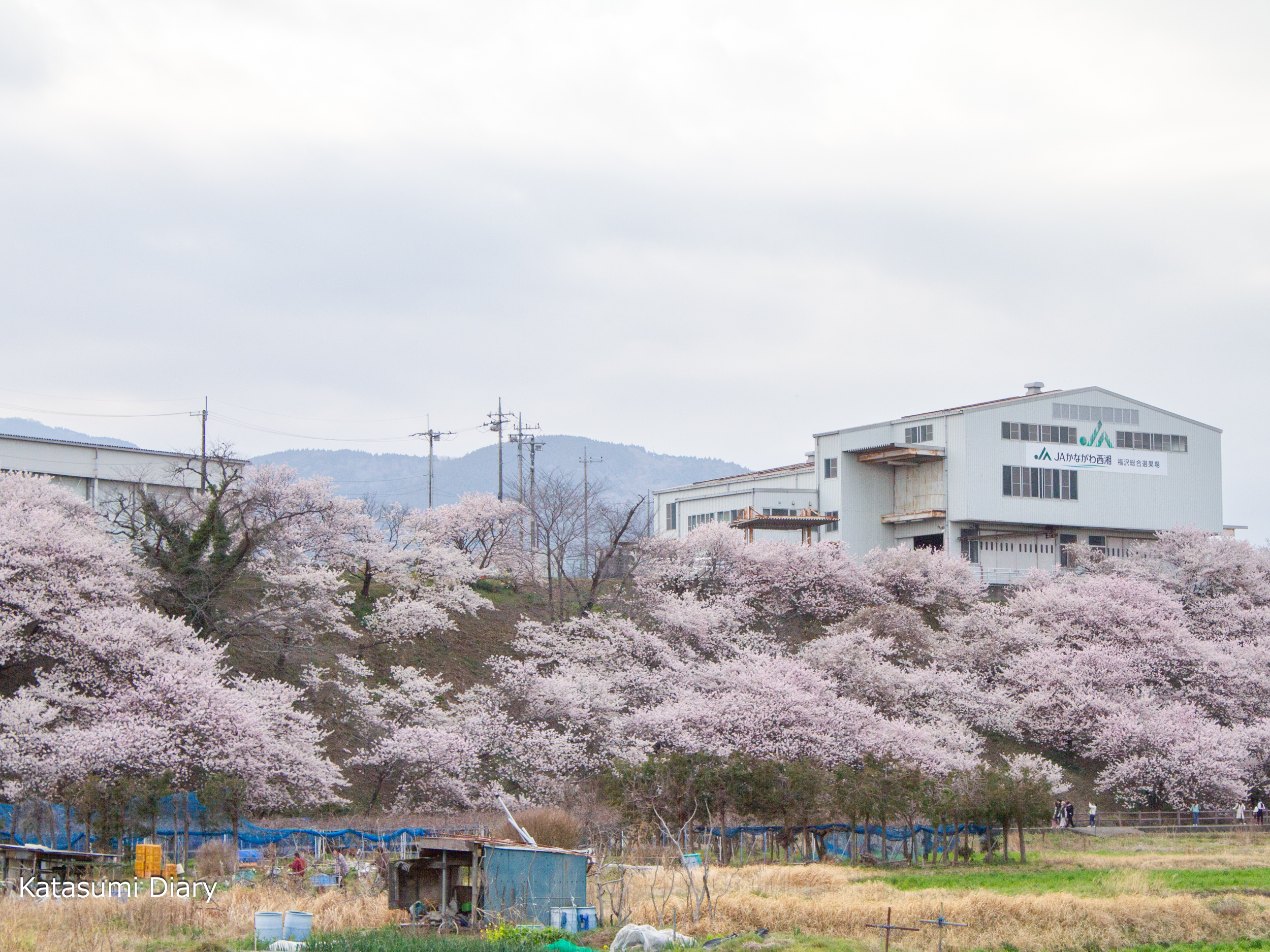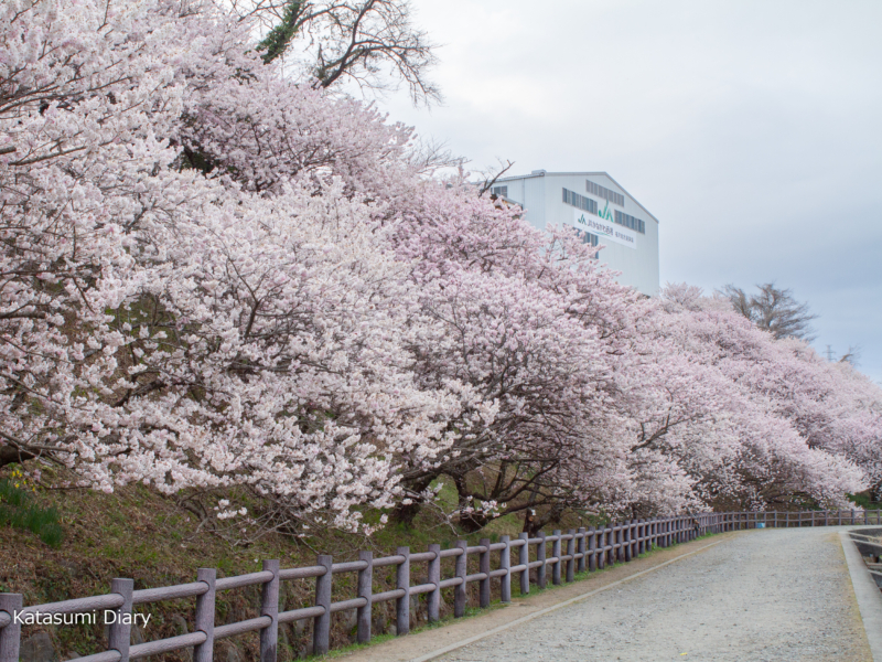 こちらは坂の途中から撮影いたしましたアングルで、丘の上のJA選果場の建物が良い味を出しており、もし建物がなかったならば少し無機質な風景となってしまい、建物がございますからこそ下の桜が映えてくる風景ではないかと思われるところとなっております。