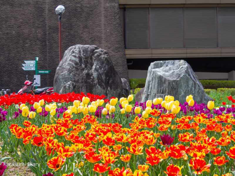 以前より駐車場脇の花壇ではネモフィラとチューリップの花を楽しむことができておりましたが、今シーズンにつきましては、ネモフィラは少なく、チューリップが大半を占める状態となっております。