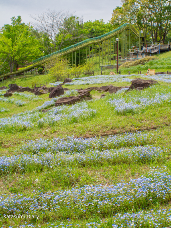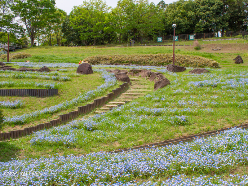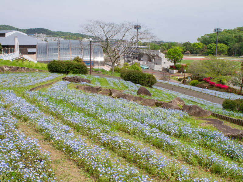 今回のカタスミ日記は、2026年4月17日に荻野運動公園を訪れてみましたので、写真を交えながら、ネモフィラの開花状況をお届けしてまいりたいと思います。
