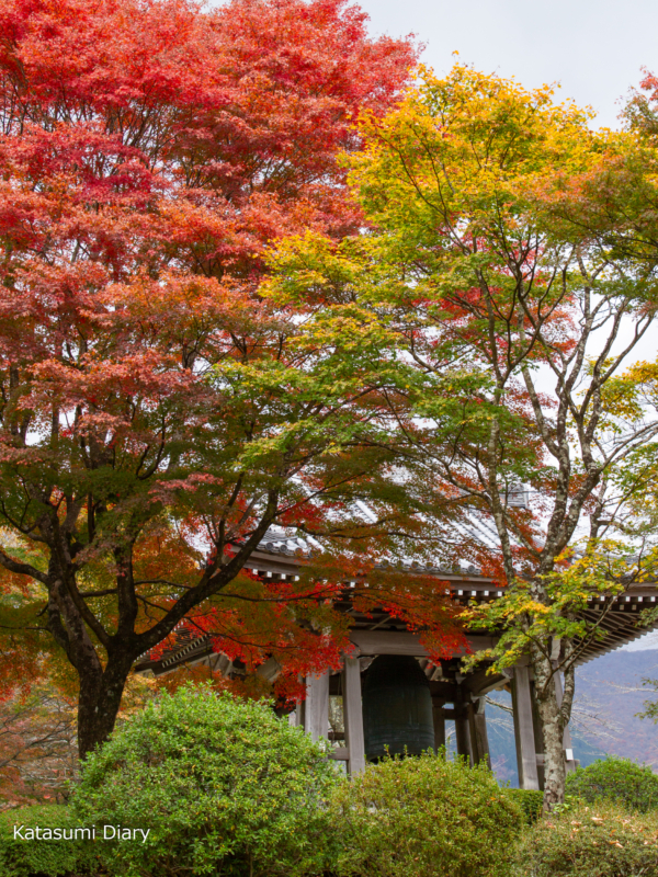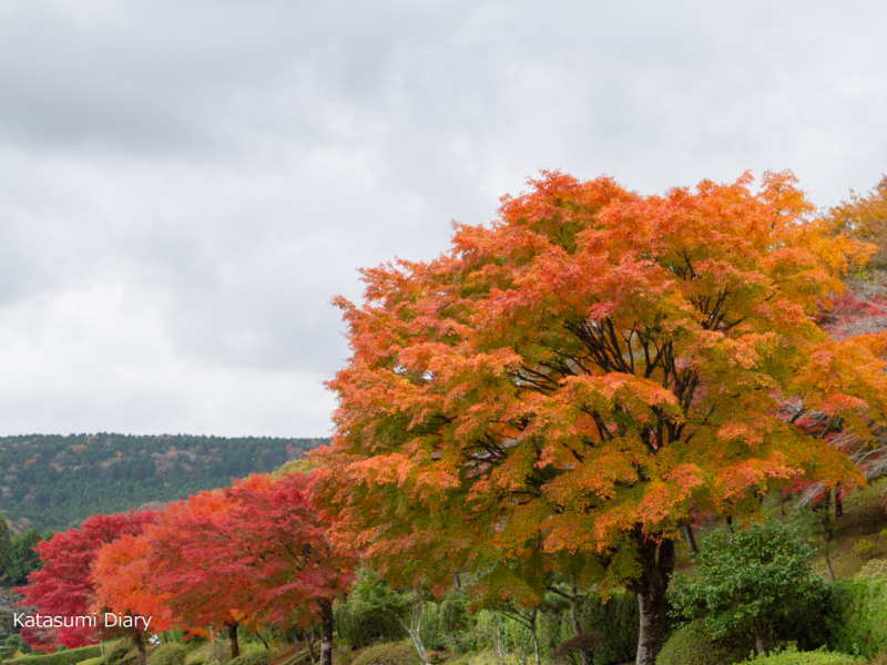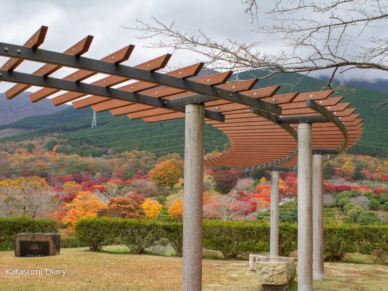 つつじ園は、春はしだれ桜、初夏はつつじの花を富士山を背景に楽しむことができるスポットでございまして、紅葉も同様に真っ赤なもみじと富士山のコラボレーションが美しい絶景スポットでございますが、生憎の曇天で富士山を望むことができませんでしたのは、少々残念なところかと思われます。