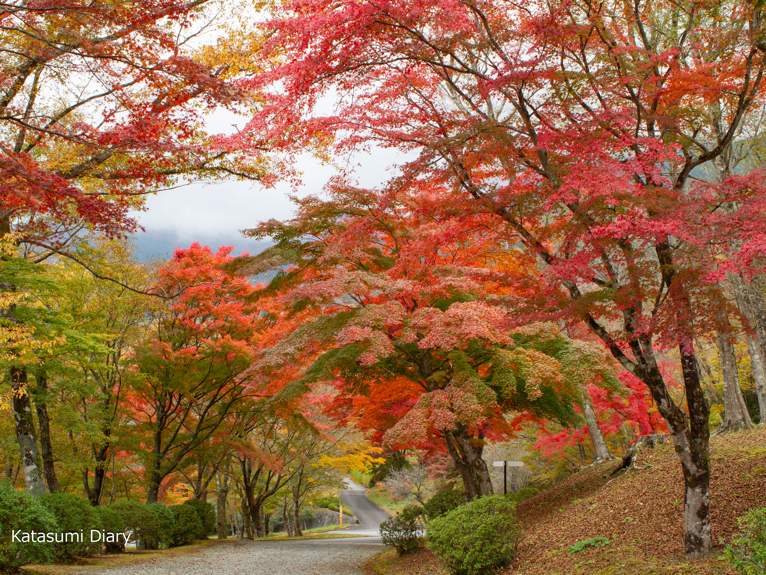 先ずは富士見会館前の無料大駐車場に車を駐車し、つつじ園の紅葉を楽しみます。