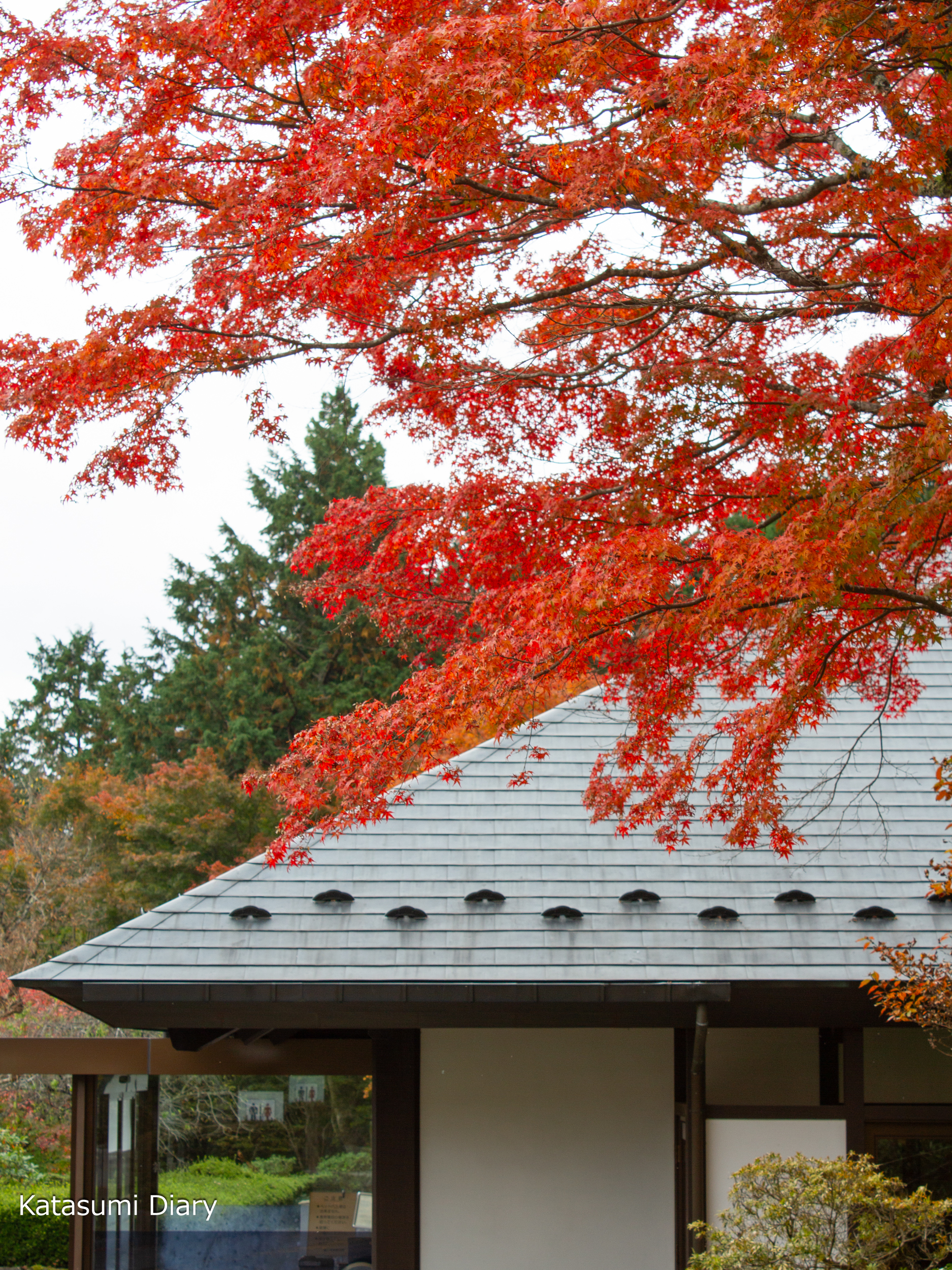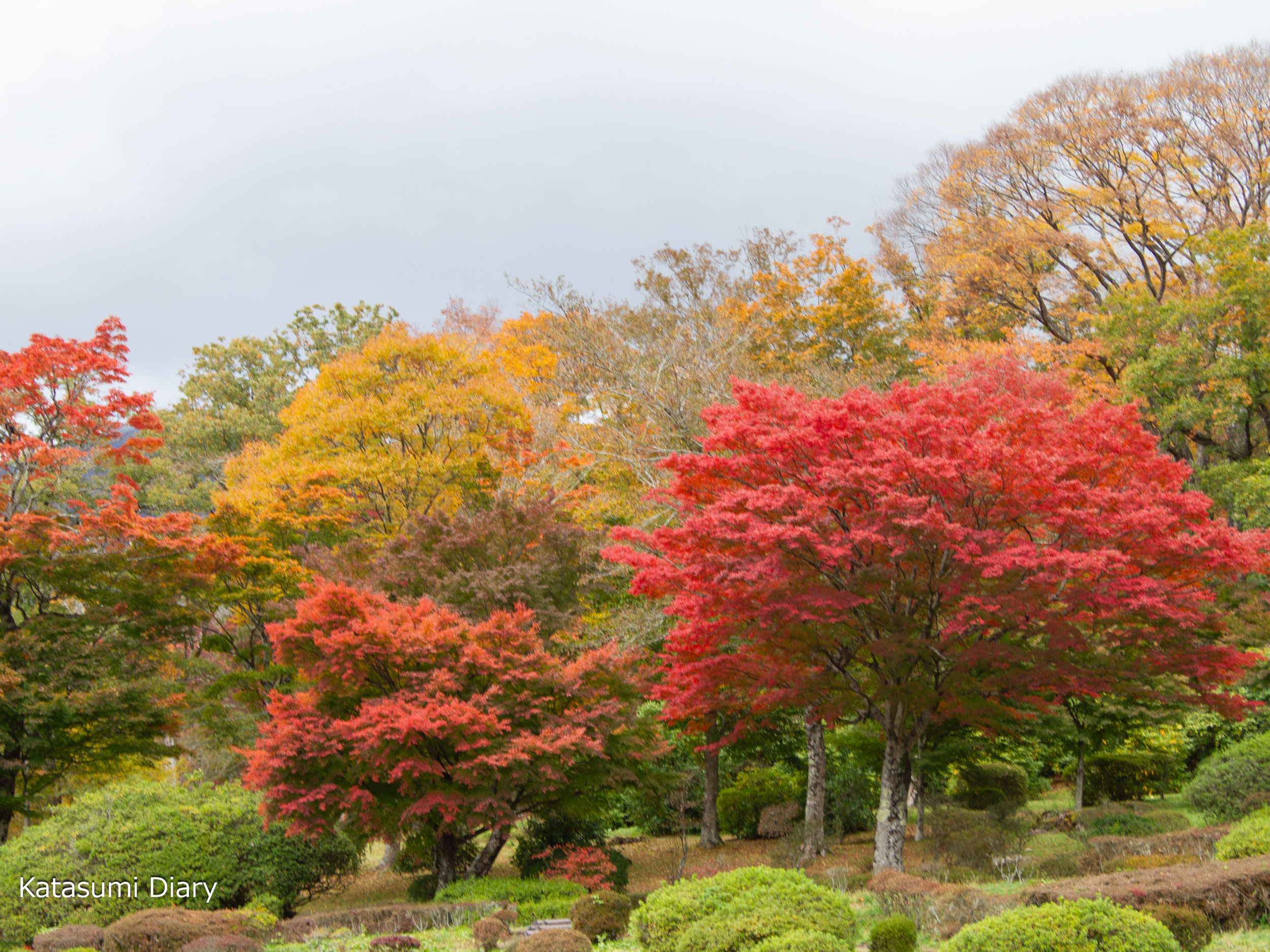 つつじ園は、春はしだれ桜、初夏はつつじの花を富士山を背景に楽しむことができるスポットでございまして、紅葉も同様に真っ赤なもみじと富士山のコラボレーションが美しい絶景スポットでございますが、生憎の曇天で富士山を望むことができませんでしたのは、少々残念なところかと思われます。