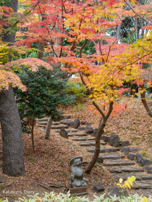 庭園の奥に設置されるたぬきの像の周りも色づいてまいりました。