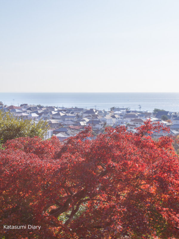 標高の高い場所に設置されておりますもう一つの展望台からは、大磯の街並み越しに青い相模湾を望むことができ(冒頭の写真)、また展望台傍の法雲堂門の周りのもみじも色づいてまいりまして風流を感じる秋の風景を楽しむことができるようになっております。