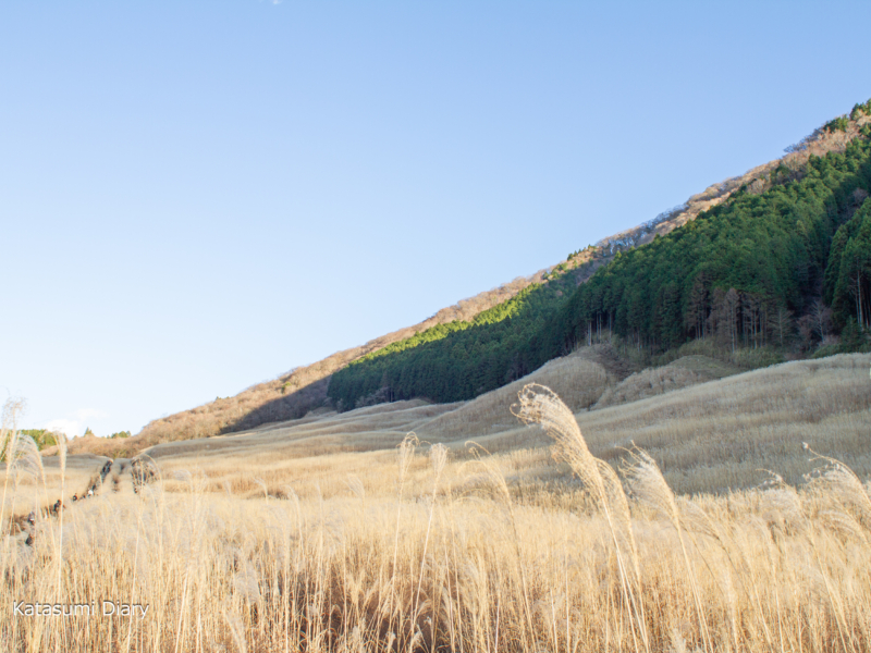 もともと江戸時代に屋根葺き用のカヤ(=ススキ)の出荷を生業としていました地域でございますが、現在では生態系の維持や景観保持の目的で管理され、毎年3月には山焼きも行われるススキの名所となっております。