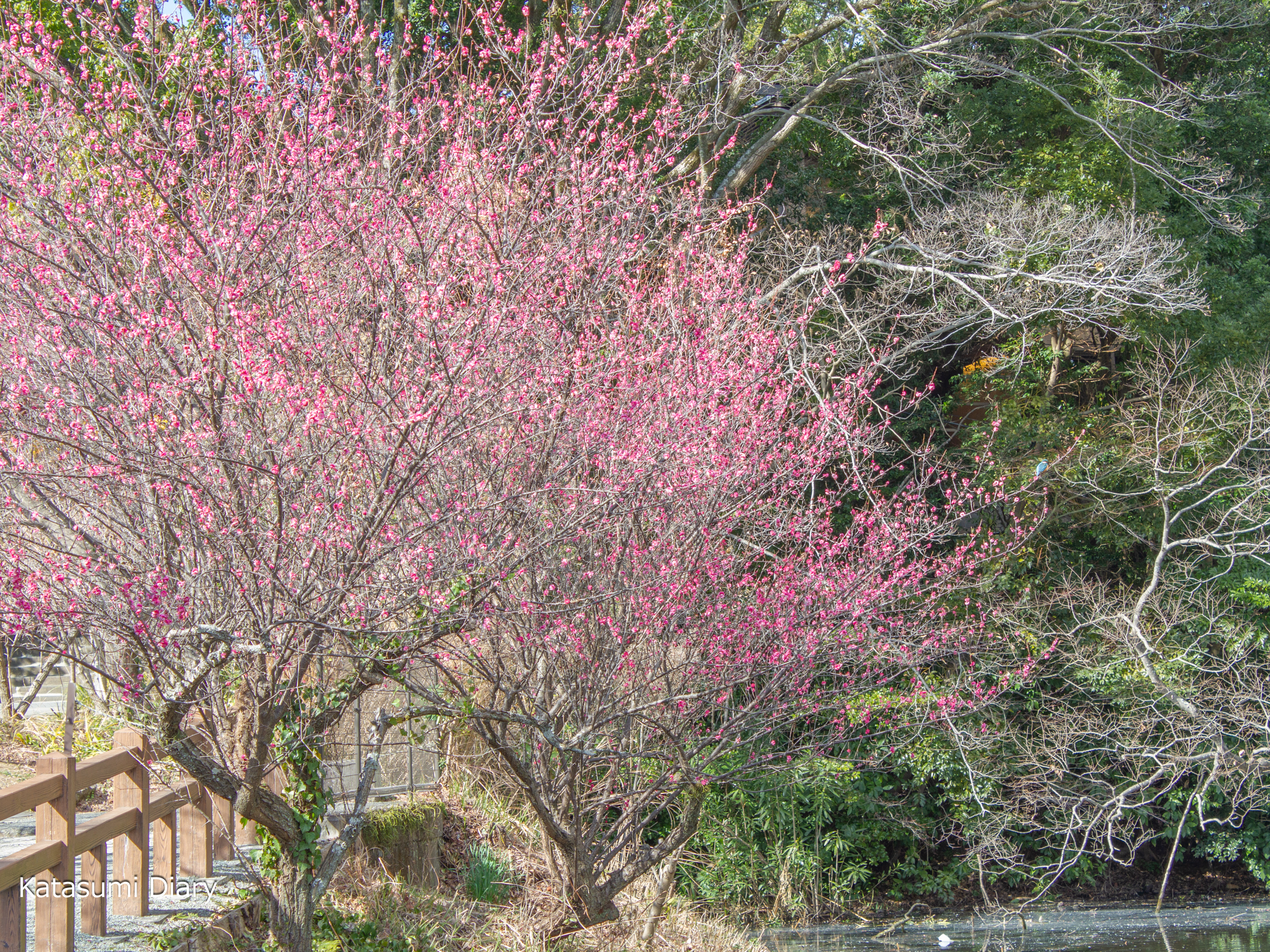 先ずは南入口から入場いたしますが、お堀の傍の梅の木にカワセミが停まっていましたので、一枚。