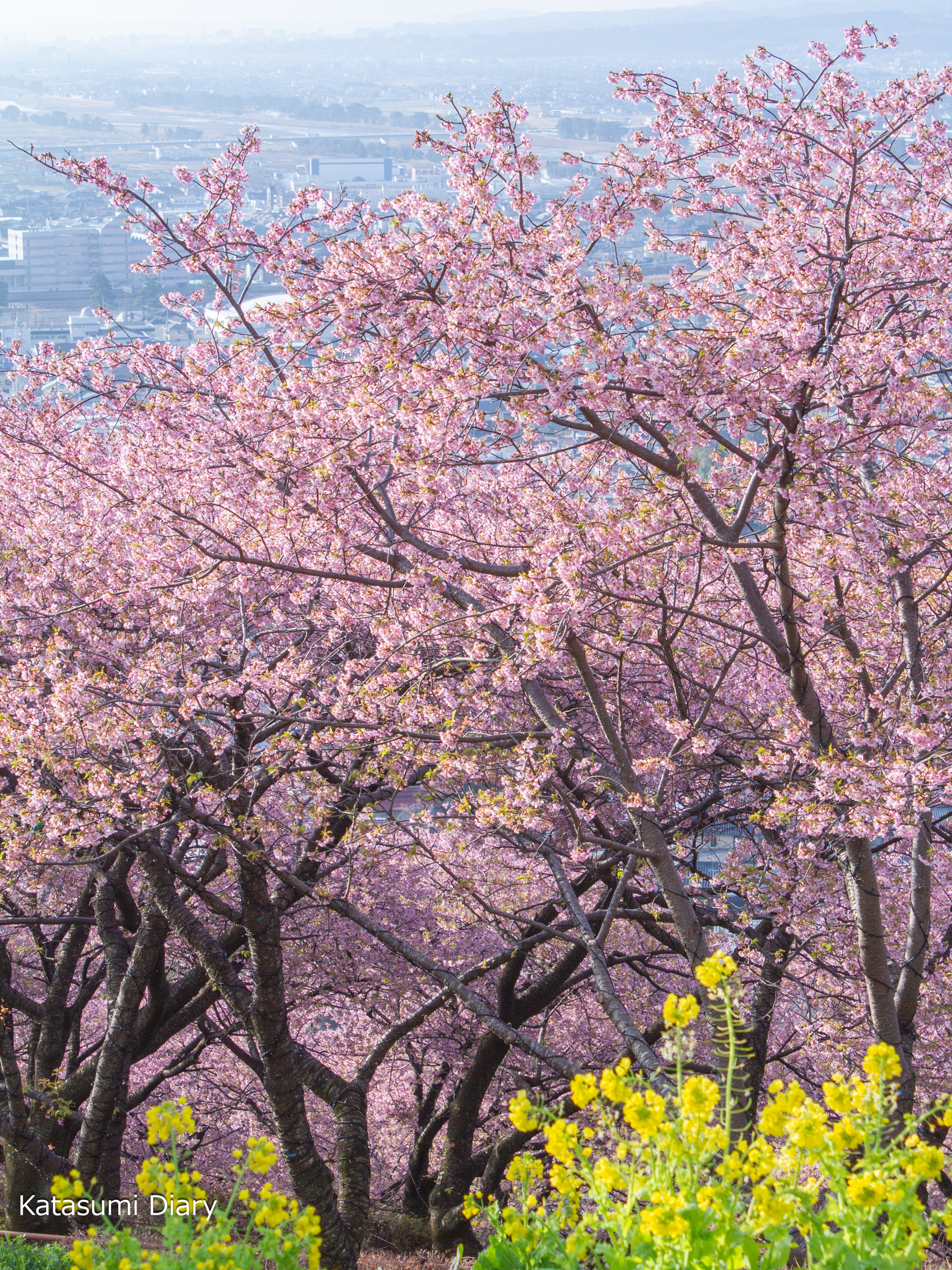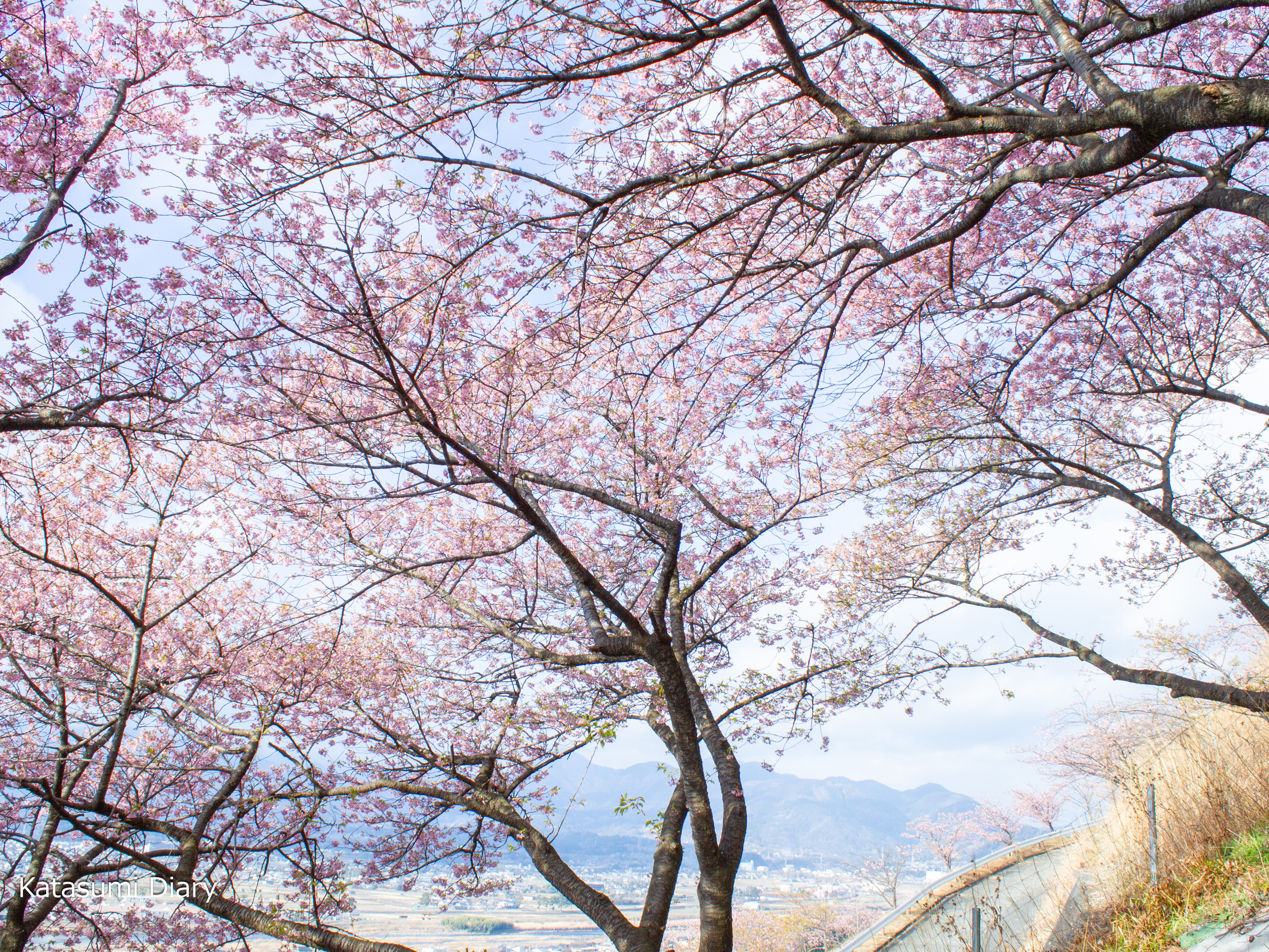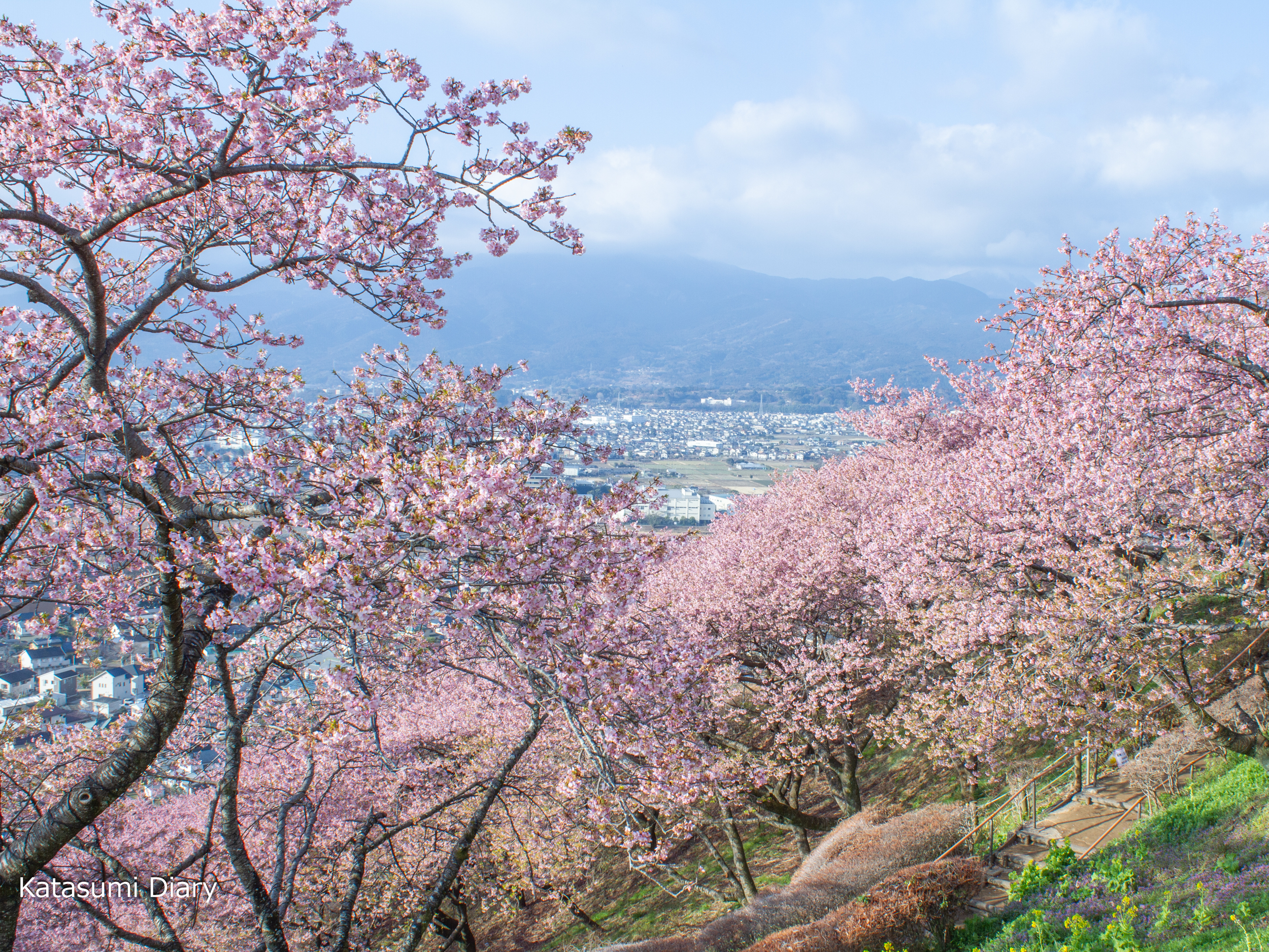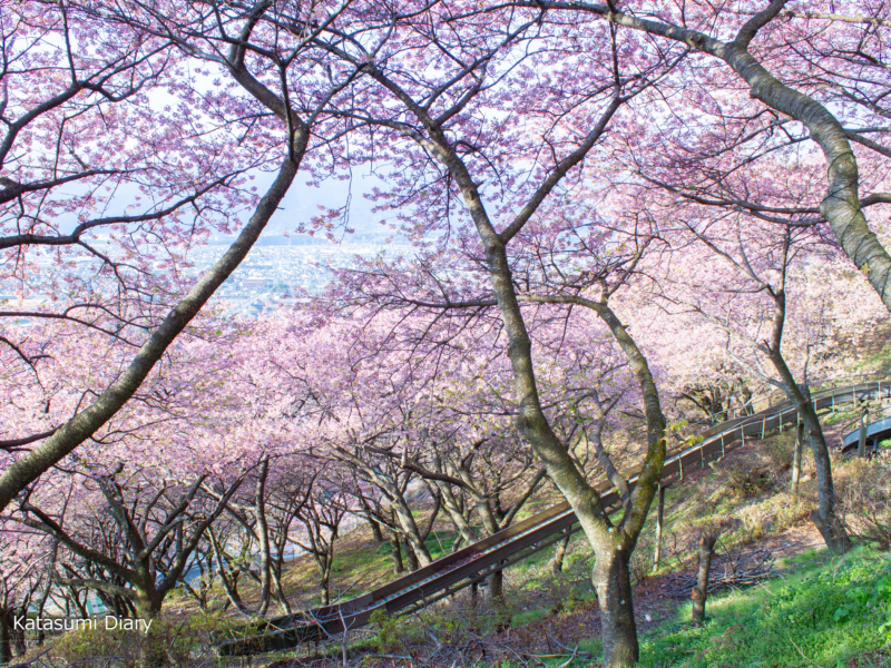 西平畑公園には、約360本の河津桜が植えられ、見頃の時期には麓の東名高速からも山の斜面がピンクに染まるのが見られるかと思われます。