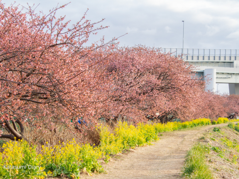 近年注目度が高まってきております小出川右岸の河津桜並木でございますが、25年ほど前から植えはじめ、現在は約70本の並木となり、足元に咲く菜の花とピンクの河津桜のコントラストが美しいお花見スポットとなっております。
