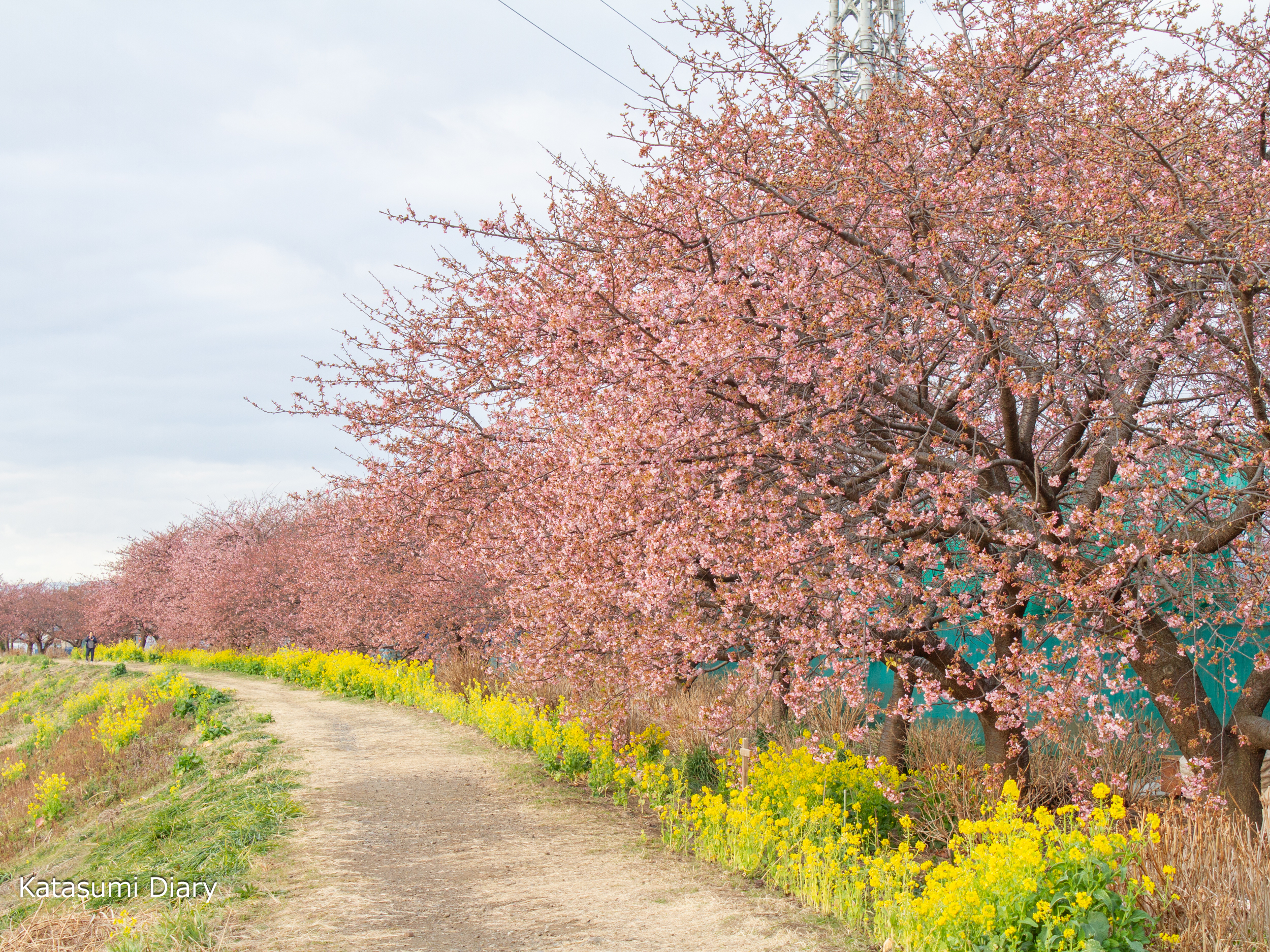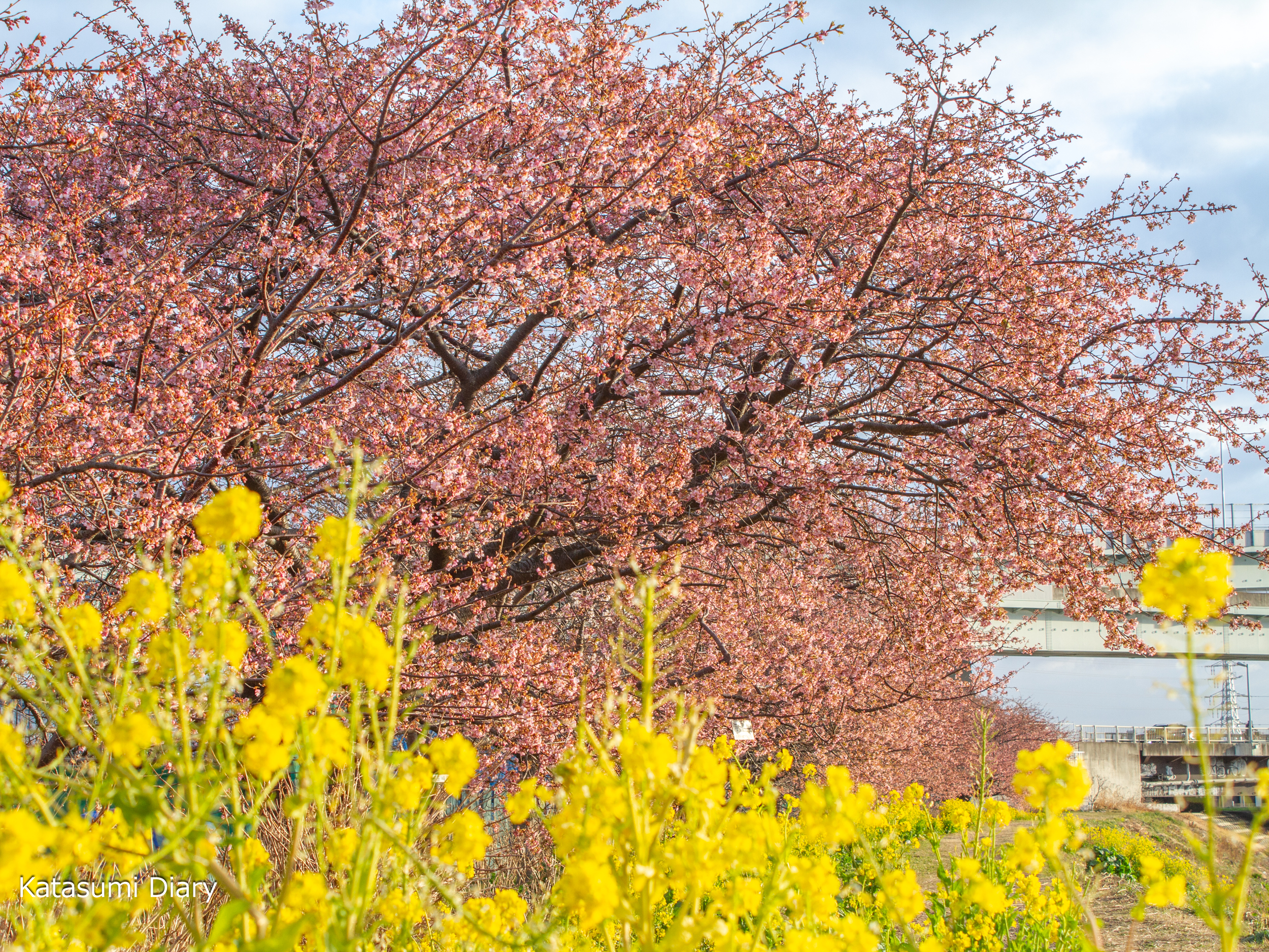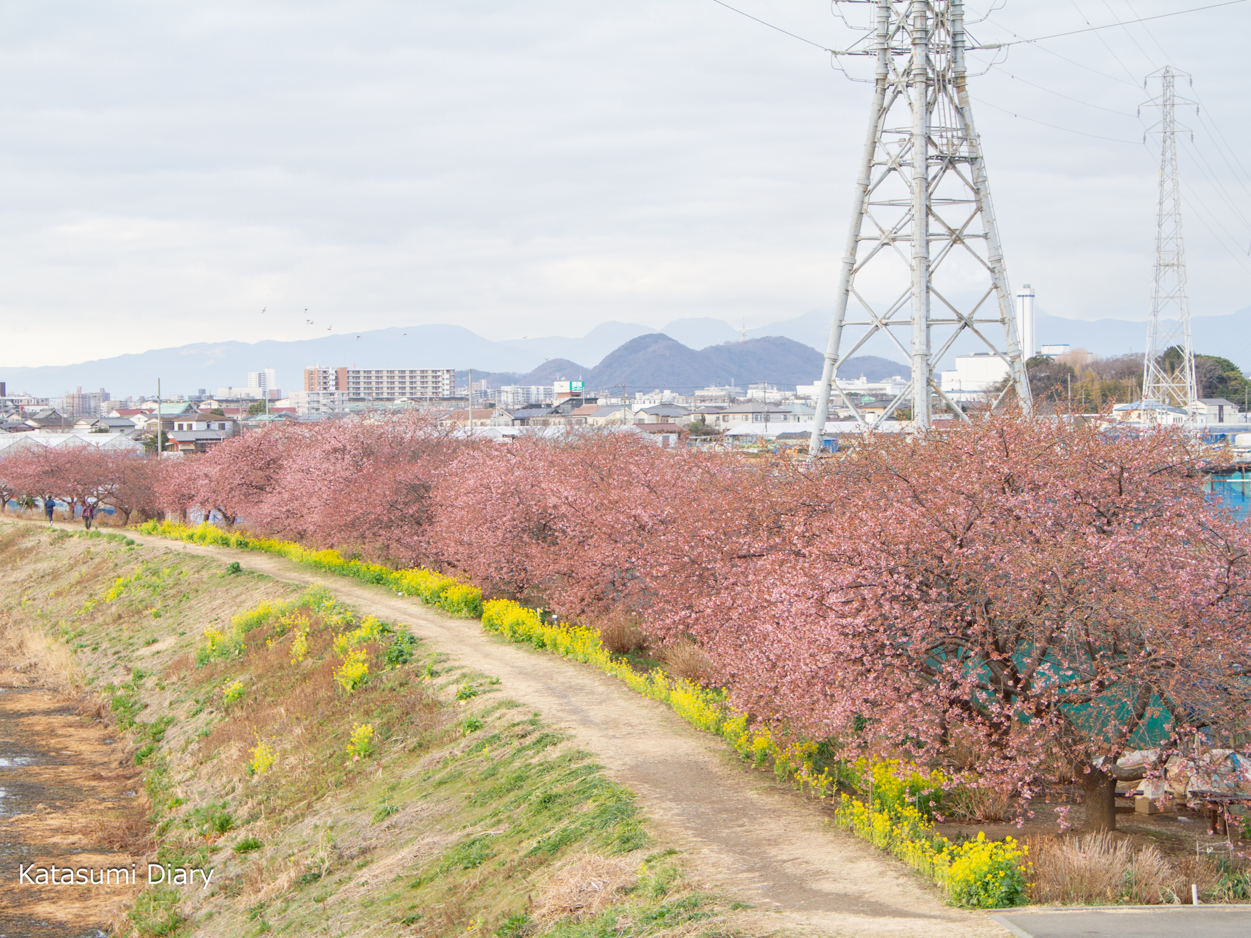 近年注目度が高まってきております小出川右岸の河津桜並木でございますが、25年ほど前から植えはじめ、現在は約70本の並木となり、足元に咲く菜の花とピンクの河津桜のコントラストが美しいお花見スポットとなっております。